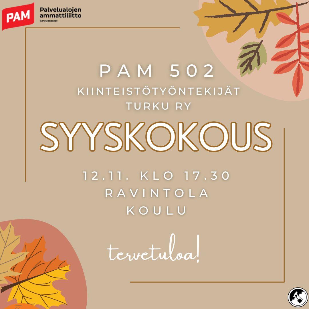 Kiinteistötyöntekijät Turku ry:n sääntömääräinen syyskokous järjestetään panimoravintola Koulussa 12.11. Tänä vuonna valitaan seuraavan kauden johtokunta ja käsitellään sääntömääräiset asiat. Kaikki jäsenemme ovat tervetulleita!