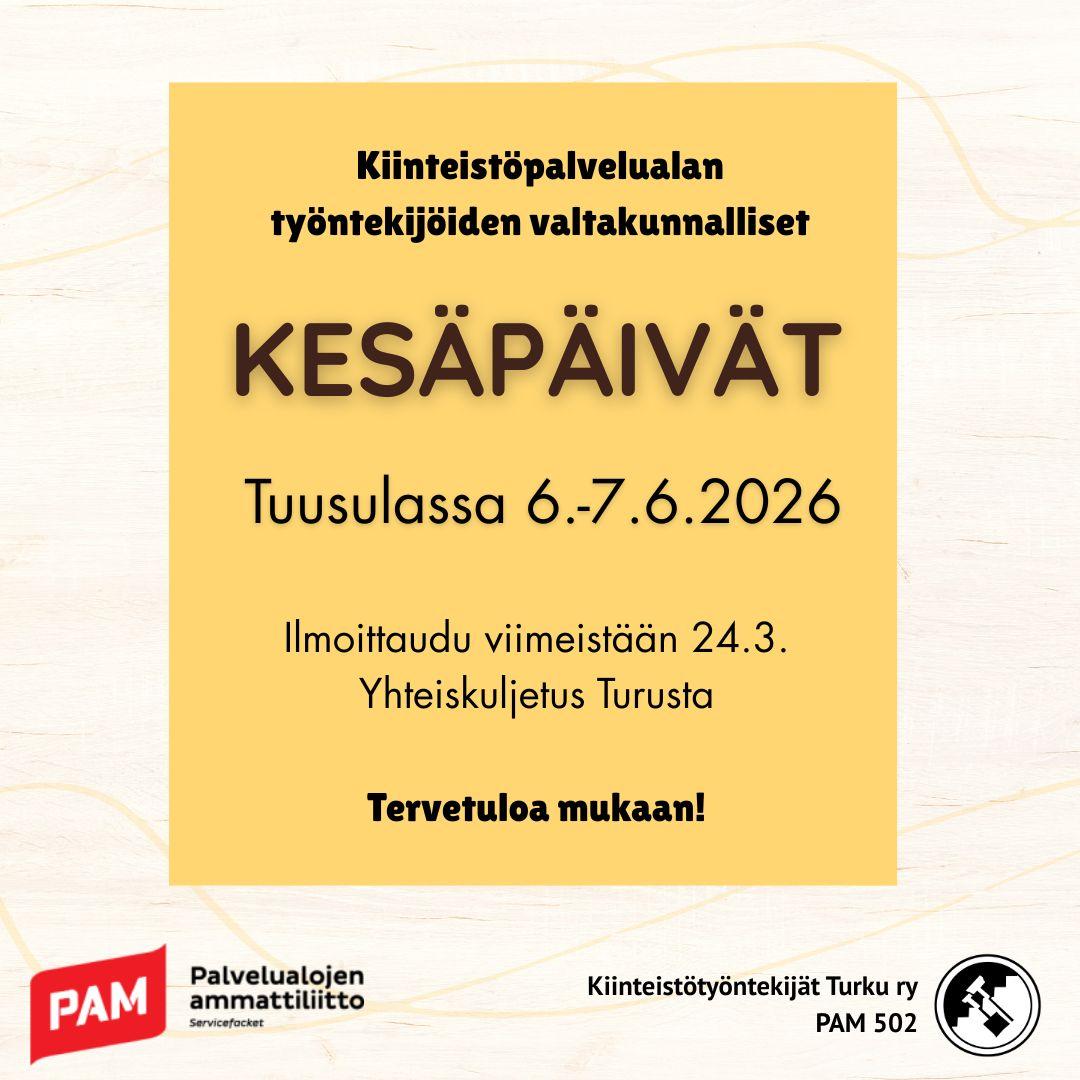 Lähde mukaamme kiinteistöpalvelualan työntekijöiden valtakunnallisille kesäpäiville Tuusulassa 6.-7.6. pitämään hauskaa ja tutustumaan ihmisiin joka puolelta Suomea!
