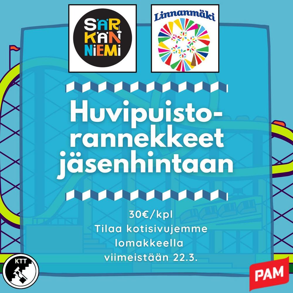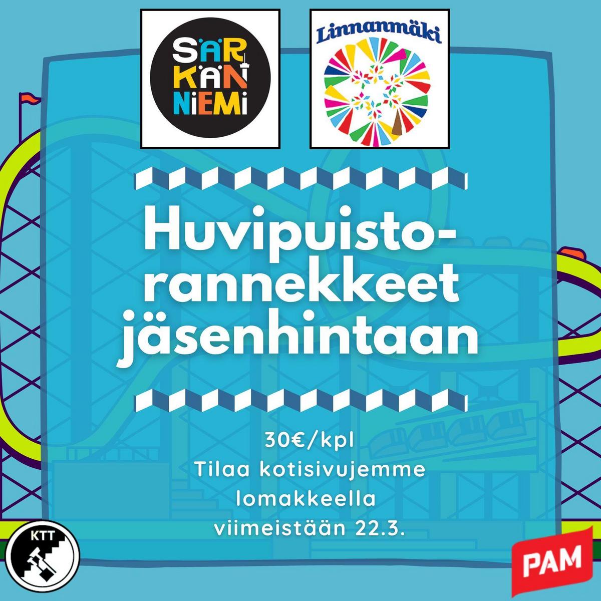 Tarjoamme jäsenhintaan 30 euroa/kpl rannekkeita huvipuistoon joko Linnanmäkeen tai Särkänniemeen. Tilaamme rannekkeita kysynnän mukaan enintään 4 kpl per jäsen. Huomaa, että ranneketta ei lähetetä sinulle postitse vaan jaamme ne ammattiosaston toimistolla, Maariankatu 6B, 6. kerros. Ilmoitamme jakopäivät myöhemmin. Postiosoitteen tarvitsemme laskutusta varten.